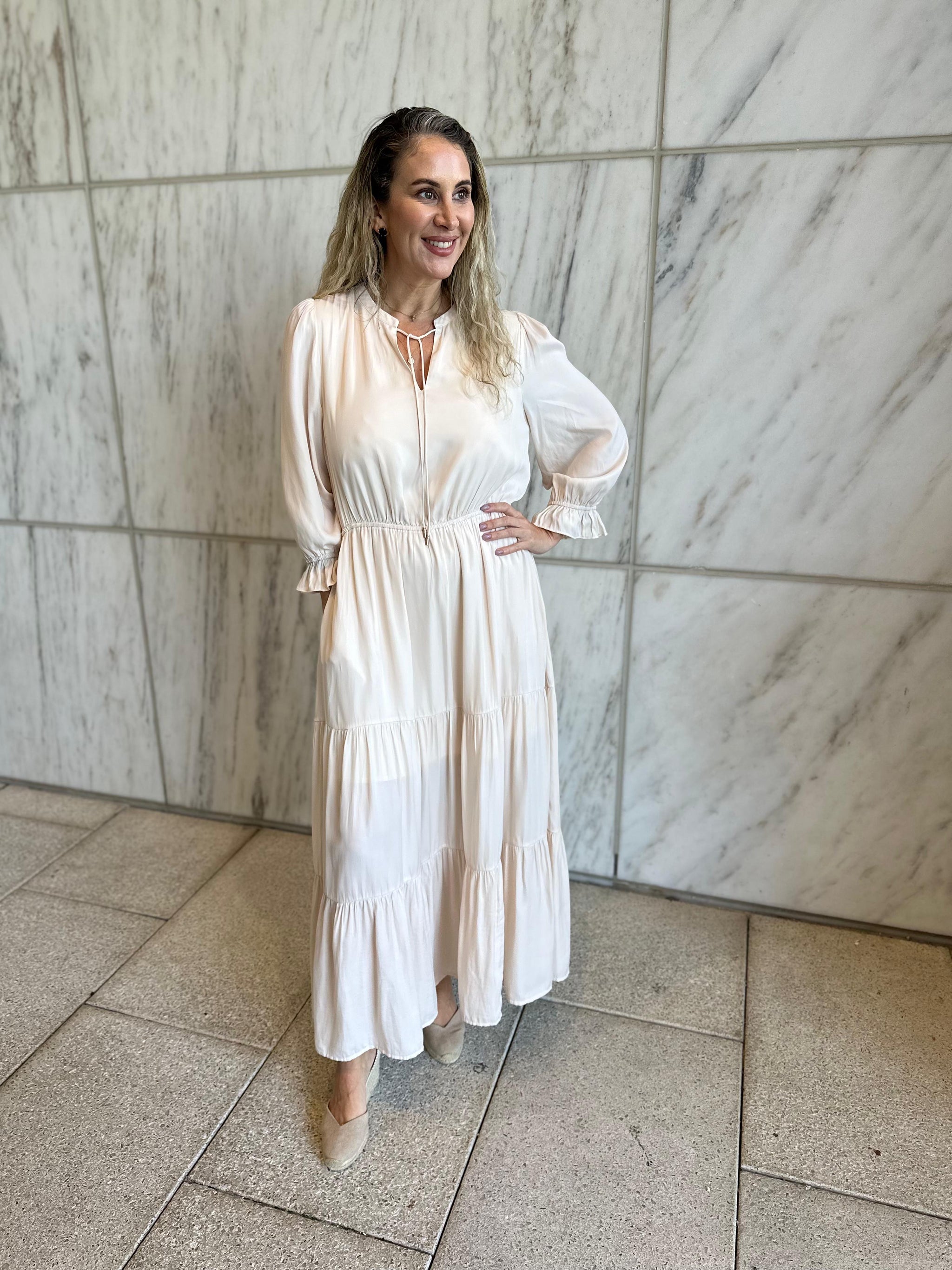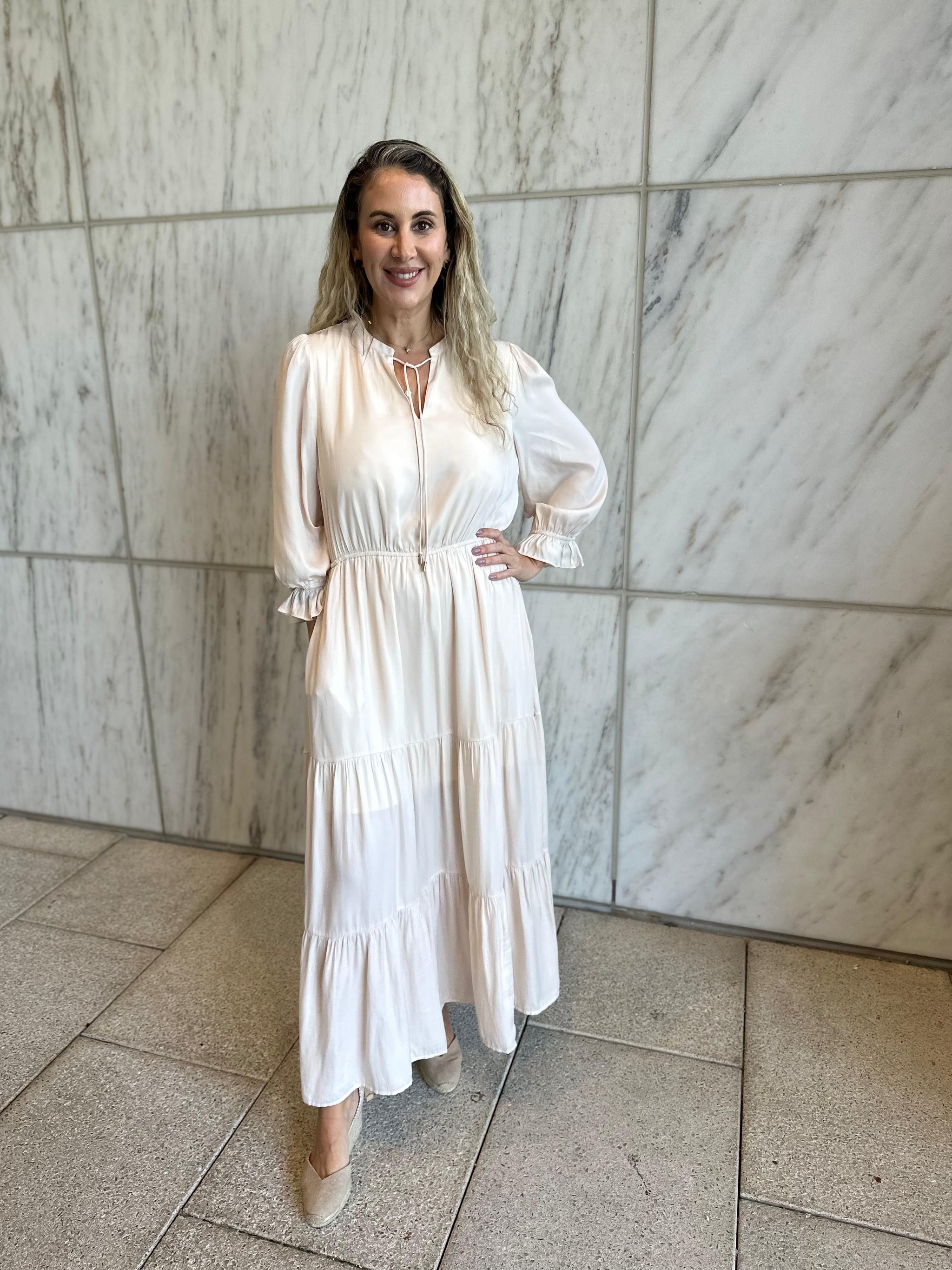 Effortless elegance with a timeless touch—this maxi dress features a flattering split neckline, soft ruffle tiers, and a flowing silhouette. Perfect for both daytime chic and evening sophistication.