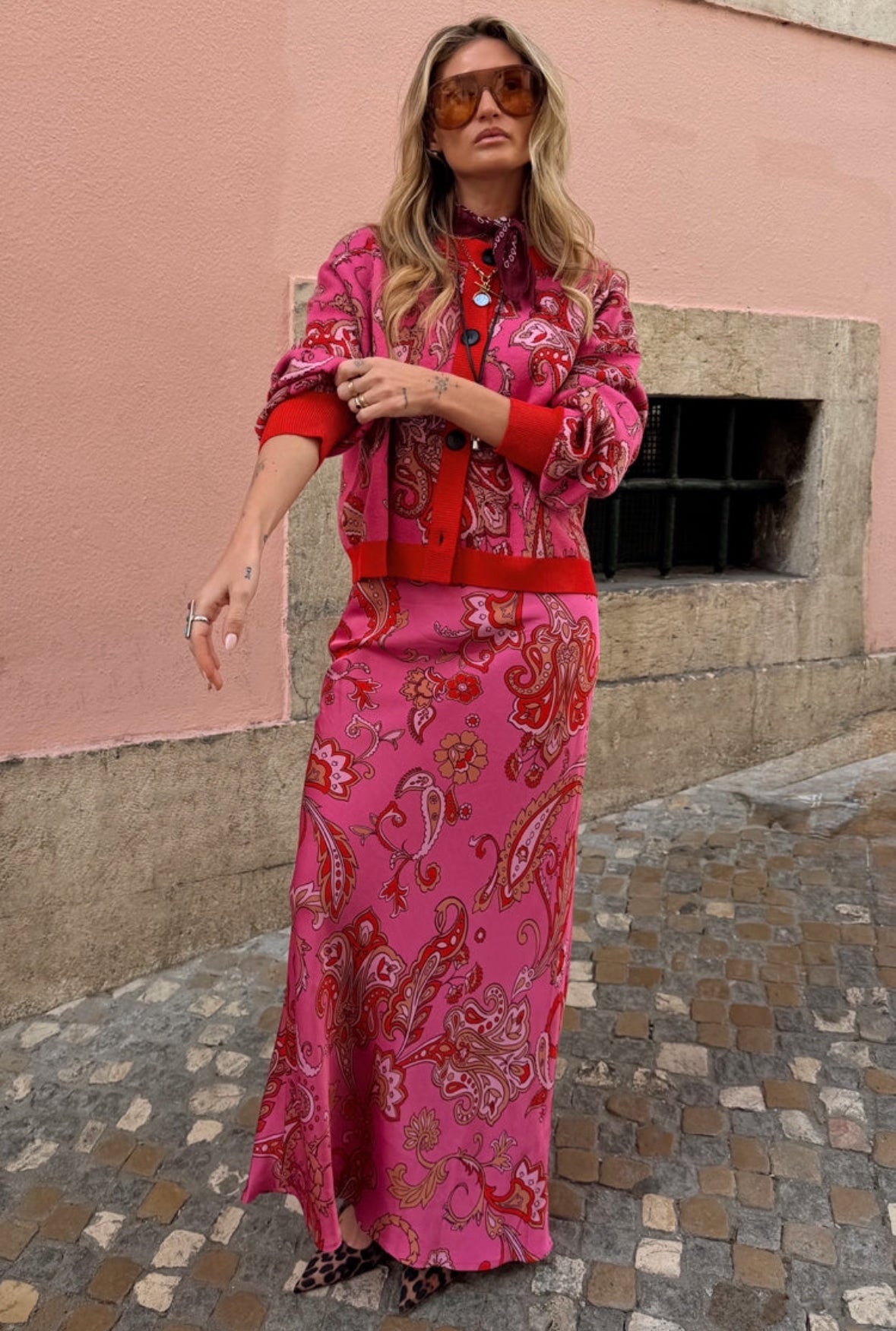 Our classic dorris silhouette in a new subtle paisley print on a bright and bold pink base! The relaxed silhouette allows you to style with ease, whether it's with a casual tee or paired with the matching cardigan and heels for a soft night out look.