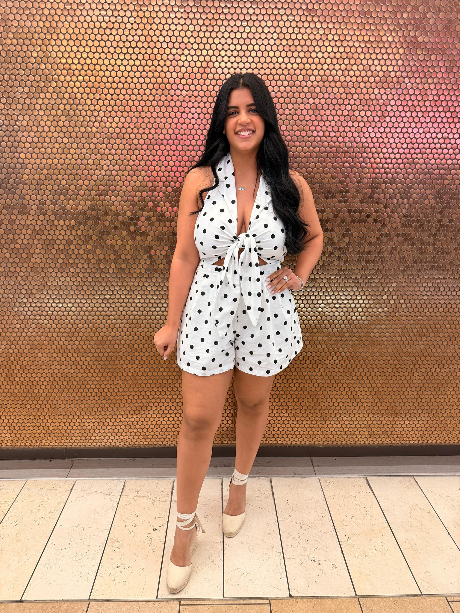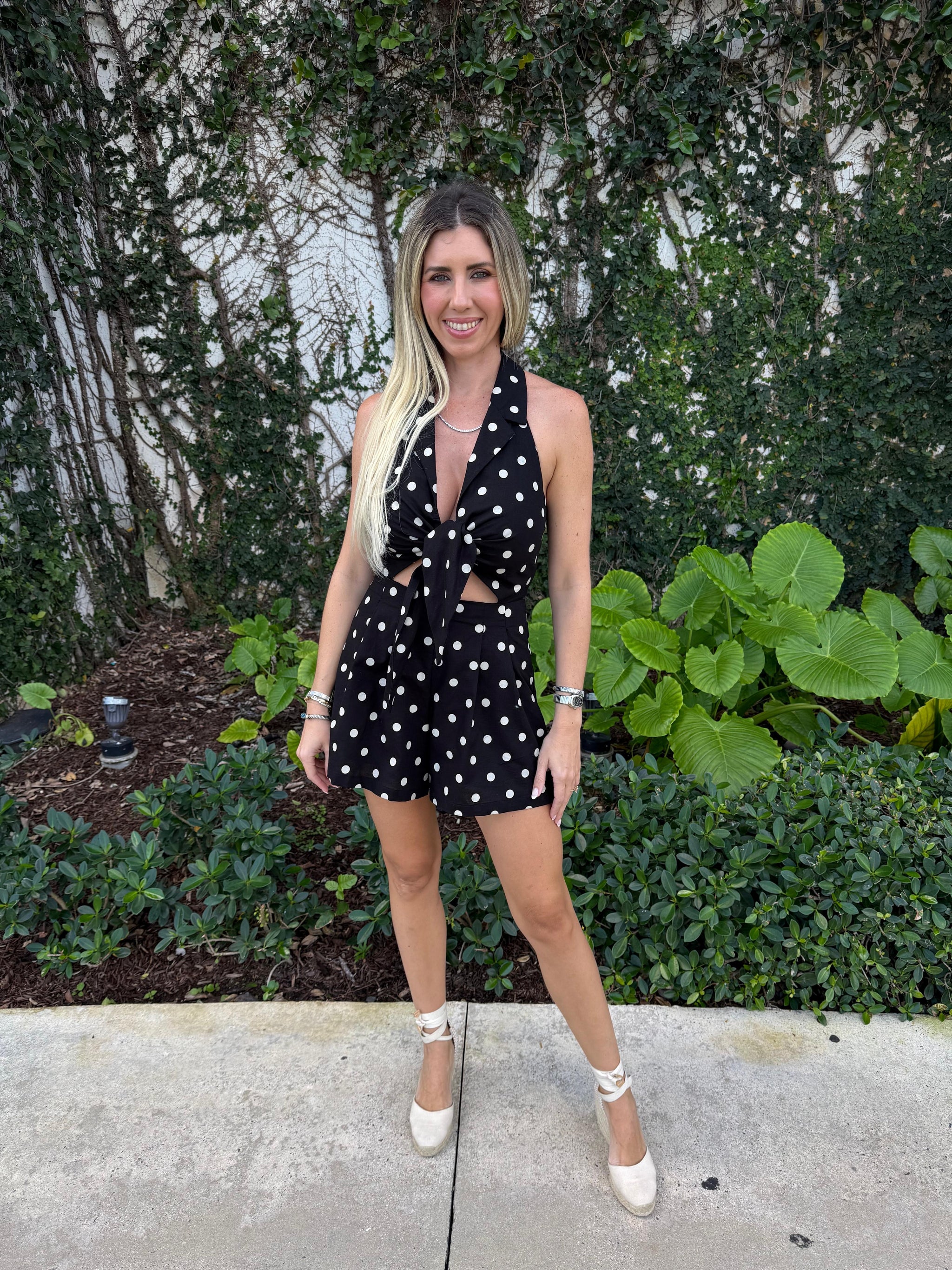 Effortlessly chic and playfully feminine, this polka dot tie front romper is your go-to piece for any occasion. The charming dot pattern adds vintage-inspired flair while the tie front detail creates a flattering silhouette that cinches at just the right spot. Perfect for brunch dates, casual outings, or weekend adventures, this versatile one-piece keeps you looking put-together without the fuss. Comfortable enough for all-day wear yet stylish enough to turn heads, it's the wardrobe essential that works as hard as you do.