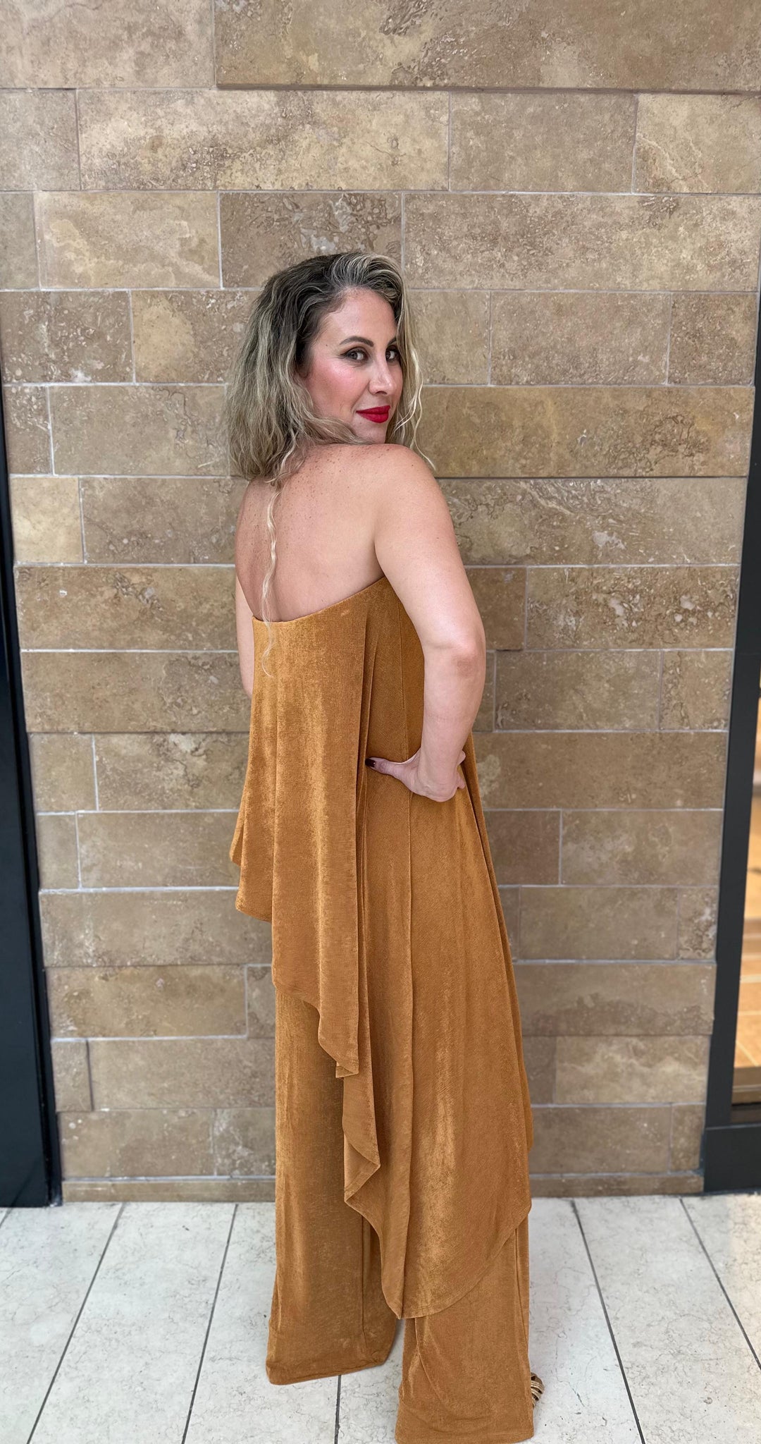 Elevate your evening look with this striking strapless asymmetrical jumpsuit. The daring neckline and unexpected hemline create an unforgettable silhouette that commands attention at any occasion. Crafted for the confident woman who refuses to blend in, this piece transitions seamlessly from cocktail events to upscale dinners. The structured bodice provides flattering support while the flowing legs offer graceful movement. Perfect for making a bold statement without saying a word.