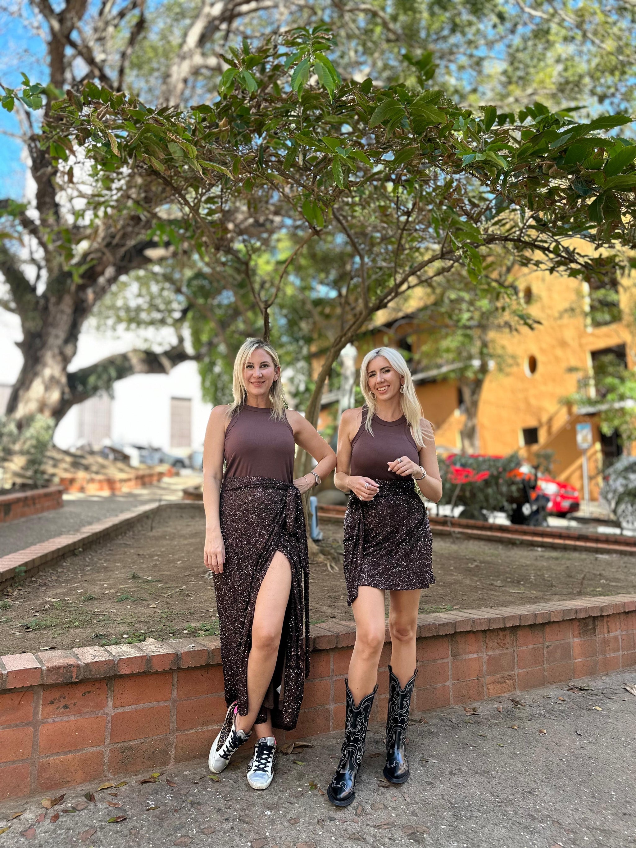 Made with hundreds of chocolate brown sequins, sewn into a heavy glossy satin base. It has an adjustable wrap waist for versatility with fit and styling, and the weight of the fabric skims the figure beautifully. Pair with gold jewellery to tie in with its warm tone.