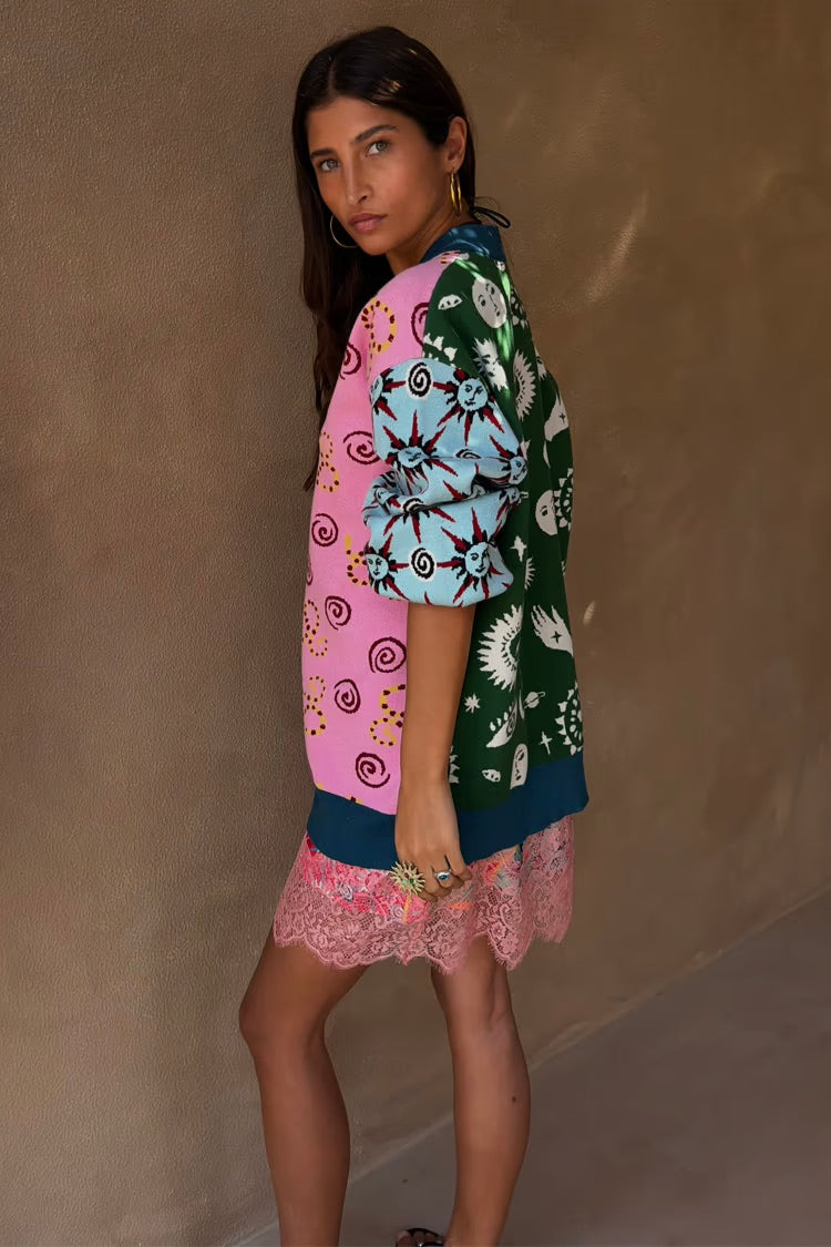 Our bestselling knits are weighty, soft touch and a definite wardrobe staple! In our new morocco print, block colours with a range of motifs including our sun, eye and snake designs as well as our bestselling tan sun print. The slightly more subtle blue hems neutralise the bold print and tie the colours together. We've paired with the morocco mini maeva as we love to clash print however you could also add to a jean for an everyday wear.
