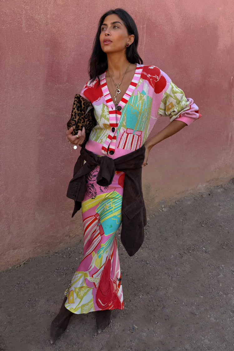 Our bestselling knits are weighty, soft touch and a definite wardrobe staple! Our new dallas print range features abstract cowboy silhouettes and cowgirl motifs, create in-house by our design team. A bright and bold colourway, with the pink stripe detailing on the button stand adding an extra touch of NFD flare. Pair with the matching dorris skirt for the perfect feel good throw on!